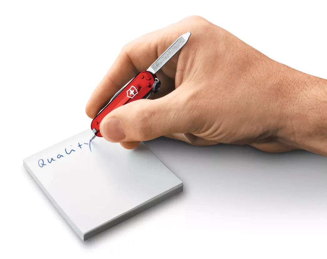 "Can I borrow a pen?" It's a phrase you can strike from your vocabulary once you've slipped the Signature knife into your pocket. Because not only does it include all the traditional features of a Swiss Army Knife, it also includes a ballpoint pen. The Signature series has you covered like no other pocket knife.