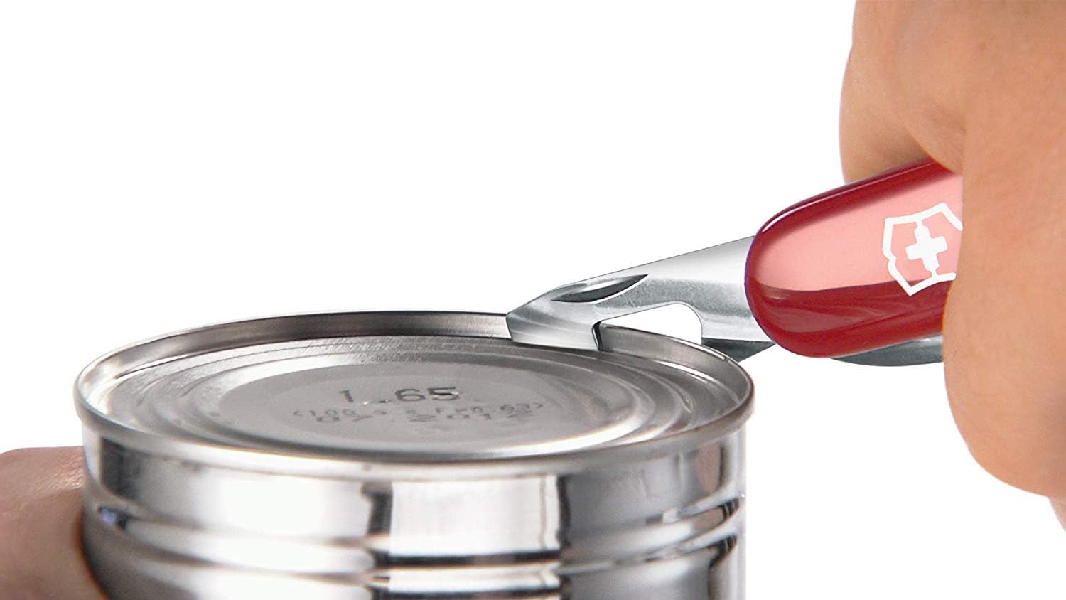- FUNCTIONS: Swiss made pocket knife with 12 functions. Blade large, Blade small, Corkscrew, Can opener, Screwdriver 3 mm, Bottle opener, Screwdriver 6 mm, Wire stripper, Reamer punch and sewing awl, Key ring, Tweezers, Toothpick.